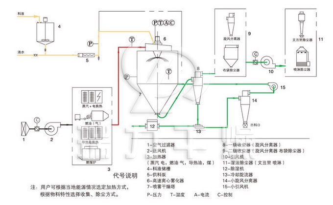噴霧干燥機為開式循環,并流式,離心式霧化。干燥介質空氣經過初、中效空氣過濾器過濾后根據操作指令由鼓風機吸取再經加熱器加熱通過過濾器的熱風分配器進入噴霧干燥主塔。液體物料根據操作指令經過蠕動泵,進入旋轉的離心噴頭,在離心力作用下被分散成小霧滴。在噴霧干燥主塔內,小霧滴與熱風在充分接觸,沿其特定路徑進行熱交換后被干燥成為產品,然后通過旋風分離器實現分離,固體物料被收集,氣體介質再經過過濾后被排出。整套噴霧系統易清潔、無死角,符合GMP要求。