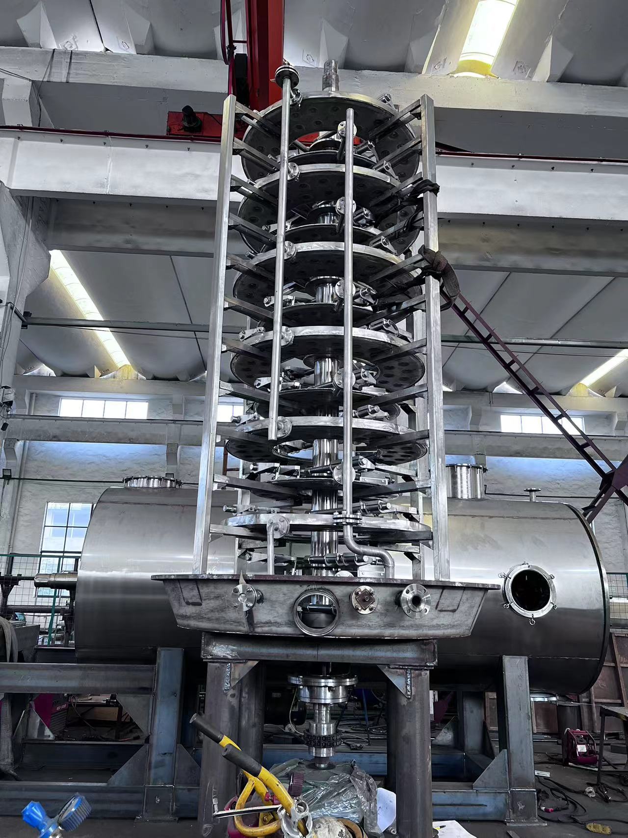 PLG系列盤式連續干燥機的一層盤上,帶有耙葉的耙臂做回轉運動,使耙葉連續地翻轉物料,物料沿著指數螺旋線流過干燥盤表面,在小干燥盤上的物料移到外緣,并在外緣落到下方的大干燥盤外緣,在大干燥盤上的物料向里移動并從中間落料落入下一層小干燥盤中,大小干燥盤上下交替排列,物料得以連續地流過整個干燥機,中空的干燥盤內通入加熱介質,加熱介質從一端進入另一端導出,已干燥物料從底層干燥盤落到殼體底層,最后被耙葉移動到料口排出。蒸發出來的水蒸汽由設置在頂部的排濕口排出,夾帶的粉塵由脈沖除塵器回收,尾氣由排濕風機排出室外。底部排出的干物料可直接包裝。