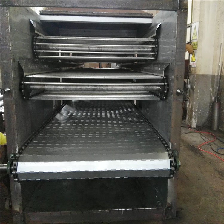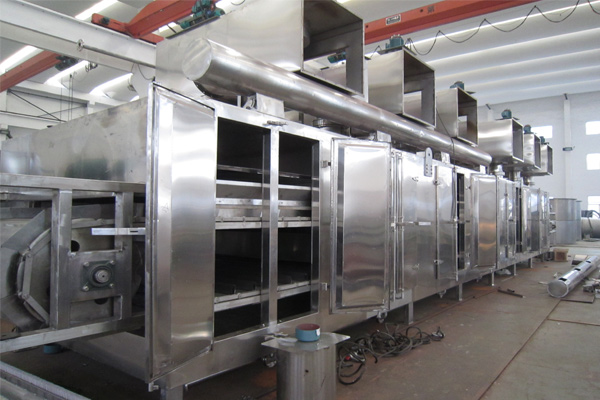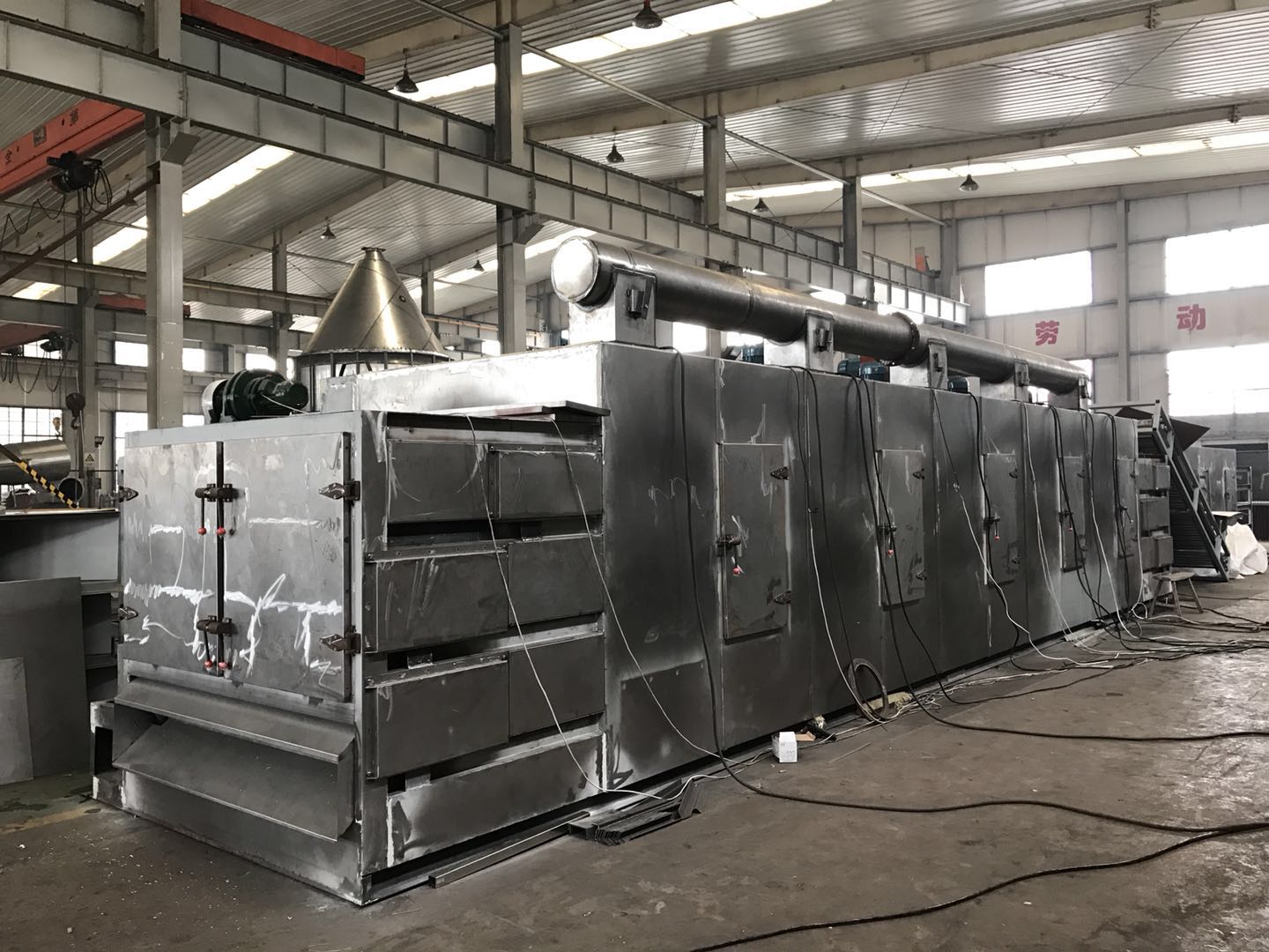 物料由加料器均勻地鋪在網帶上,網帶一般采用12-60目不銹鋼絲網,由傳動裝置拖動在干燥機內移動。干燥機由若干單元組成,每一單元熱風獨立循環(huán),部分尾氣由專門排濕風機排出,廢氣由調節(jié)閥控制,熱氣由下往上或由上往下穿過鋪滿物料的網帶完成熱量與質量傳遞的進程,帶走物料水份。網帶緩慢移動,運行速度可根據物料溫度自由調節(jié),干燥后的成品連續(xù)落入收料器中。上下循環(huán)單元根據用戶需要可靈活配備,單元數量亦可根據需要選取。