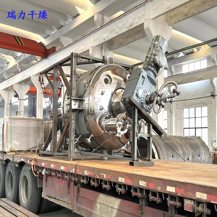 三合一真空干燥機(jī)主要由驅(qū)動系統(tǒng)、電機(jī)減速機(jī)、機(jī)架、軸承、錐形筒體(帶有夾套)、攪拌螺帶、取樣閥、填料密封等部件組成。設(shè)備采用電機(jī)減速機(jī)與攪拌螺帶直連的方式,變頻調(diào)速,轉(zhuǎn)速0~20rpm,螺帶與攪拌軸在特定胎具中進(jìn)行焊接,使得螺帶與桶壁的間隙均勻,確保了運(yùn)轉(zhuǎn)過程的穩(wěn)定性;在攪拌軸和封頭之間采用柔性石墨填料密封,有效的防止了外界雜質(zhì)的進(jìn)入。錐形筒體和橢圓封頭都帶有夾套,可通入不同種類的熱介質(zhì)并能承受一定壓力,在攪拌混合的同時(shí)進(jìn)行加熱,實(shí)現(xiàn)物料的干燥目的,干燥效果較好,運(yùn)行穩(wěn)定。