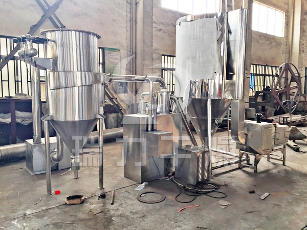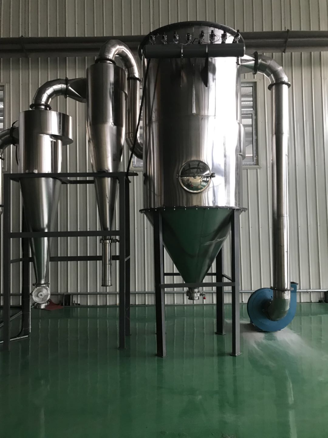 血漿血球蛋白粉是由供料系統、介質循環系統、空氣加熱凈化系統、干燥塔系統、收料系統、控制系統等多個系統整合而成。主塔系統集中了目前噴霧干燥工程的所有尖端技術,噴干機組的收料系統由一級旋風分離器+布袋除塵器組合形成。一級旋風采用高氣量高效率旋風進行收集,其收粉率能達到96%左右分,而布袋除塵器是針對蛋白粉類除塵專門設計的優化設備,能使物料與風進行完全分離并沉降,布袋為拒水防油防靜電布袋,過濾目數可達500目以上。