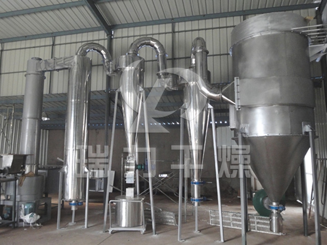 熱空氣切線進入干燥器底部,在攪拌器帶動下形成強有力的旋轉風場。膏狀物料由螺旋加料器進入干燥器內,在高速旋轉攪拌槳的強烈作用下,物料受撞擊、磨擦及剪切力的作用下得到分散,塊狀物料迅速粉碎,與熱空氣充分接觸、受熱、干燥。脫水后的干物料隨熱氣流上升,分級環將大顆粒截留,小顆粒從環中心排出干燥器外,由旋風分離器和除塵器回收,未干透或大塊物料受離心力作用甩向器壁,重新落到底部被粉碎干燥。