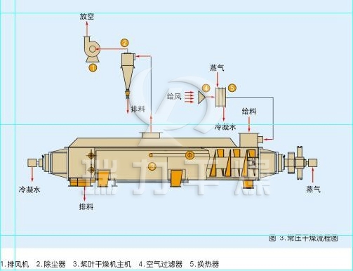 ◎漿葉干燥機能耗低: 由于間接加熱,沒有大量攜帶空氣帶走熱量,干燥器外壁又設置保溫層,對漿狀物料,蒸發1kg水僅需1.2kg水蒸汽。