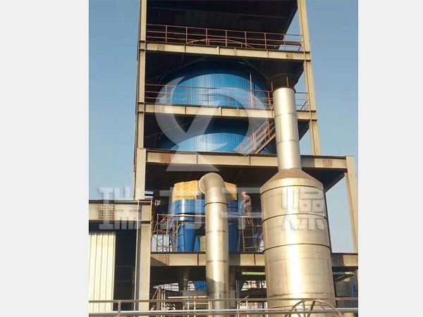 本機組工作過程為:料液通過隔膜泵高壓輸入,噴出霧狀液滴,然后同熱空氣并流下降,大部分粉粒由塔底排料口收集,廢氣及其微小粉末經旋風分離器分離,廢氣由抽風機排出,粉末由設在旋風分離器下的收粉筒收集,風機出口處還可裝備二級除塵裝置,回收率在96%-98%。